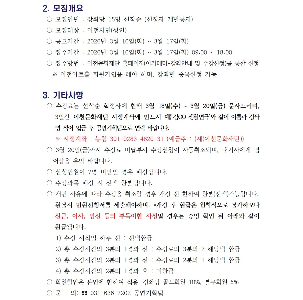 2026년 이천문화재단 상반기 예술아카데미 수강생 모집 공고