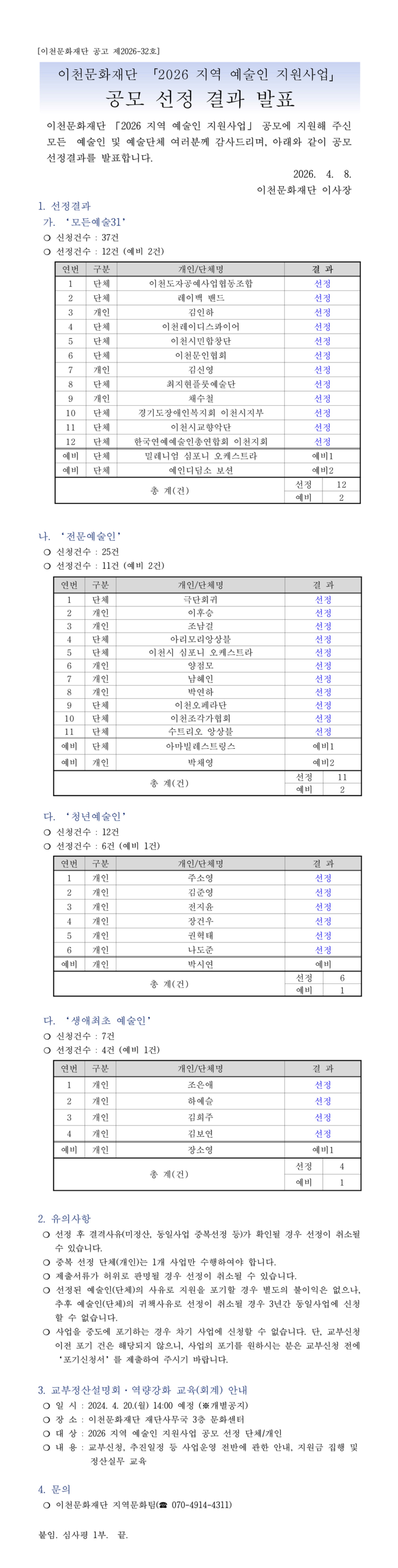 2026 지역 예술인 지원사업 공모 선정결과 발표