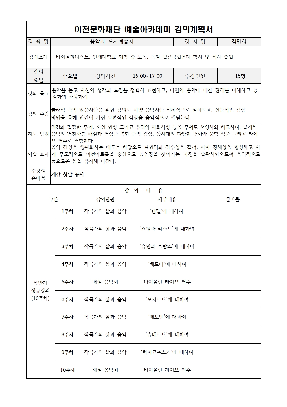 menu 전체메뉴 닫기 이천문화재단 운영목표 연혁 조직도 CI소개 경영공시 윤리인권경영 정보공개 공간소개 기록관 공연/전시/행사 공연일정 전시일정 행사일정 예매안내 아카데미 아카데미 소개 수강신청안내 강좌안내 및 수강신청 축제/지역문화 이천도자기축제 조각심포지엄 지역문화버스킹 지역예술인 지원사업 문화자치사업 대관 대관안내 대관신청(테스트) 커뮤니티 재단소식 자유게시판 1:1문의하기 FAQ