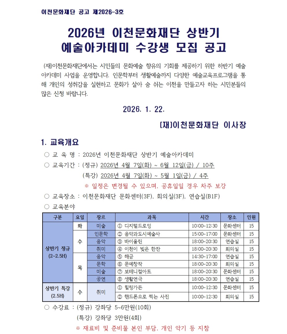 2026년 이천문화재단 상반기 예술아카데미 수강생 모집 공고