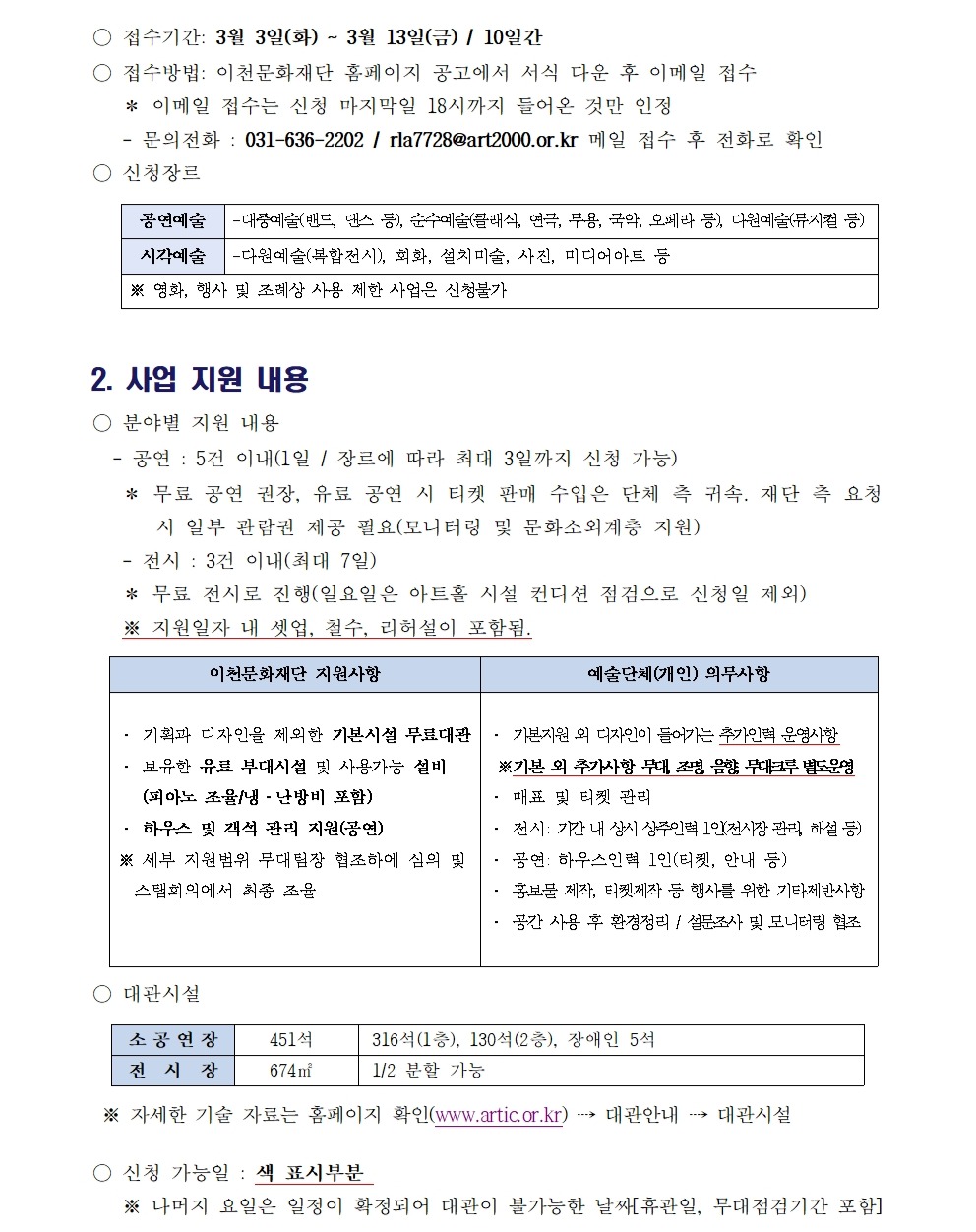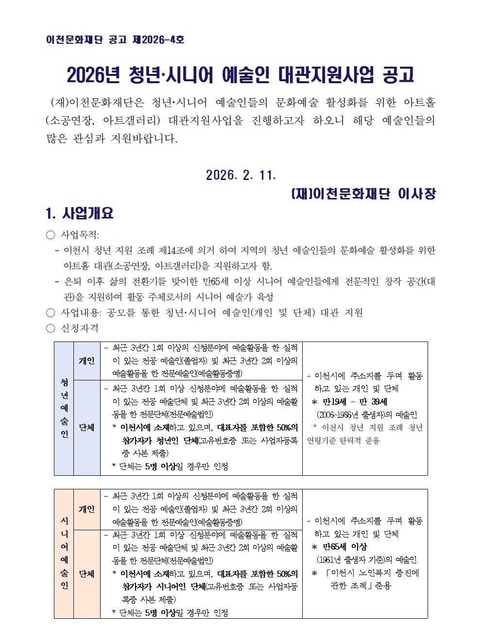 2026년 이천문화재단 청년시니어예술인 대관 지원사업 모집 공고