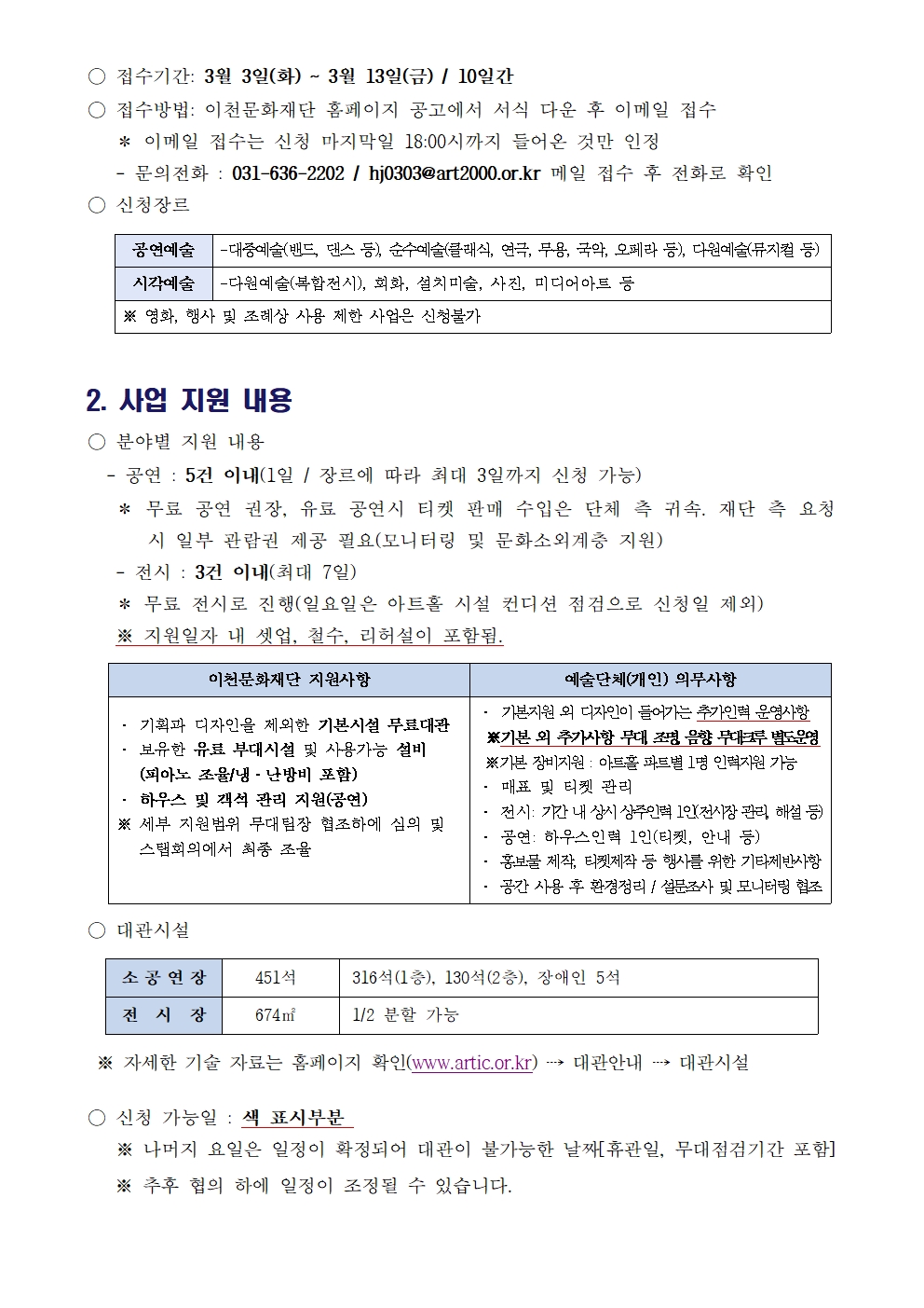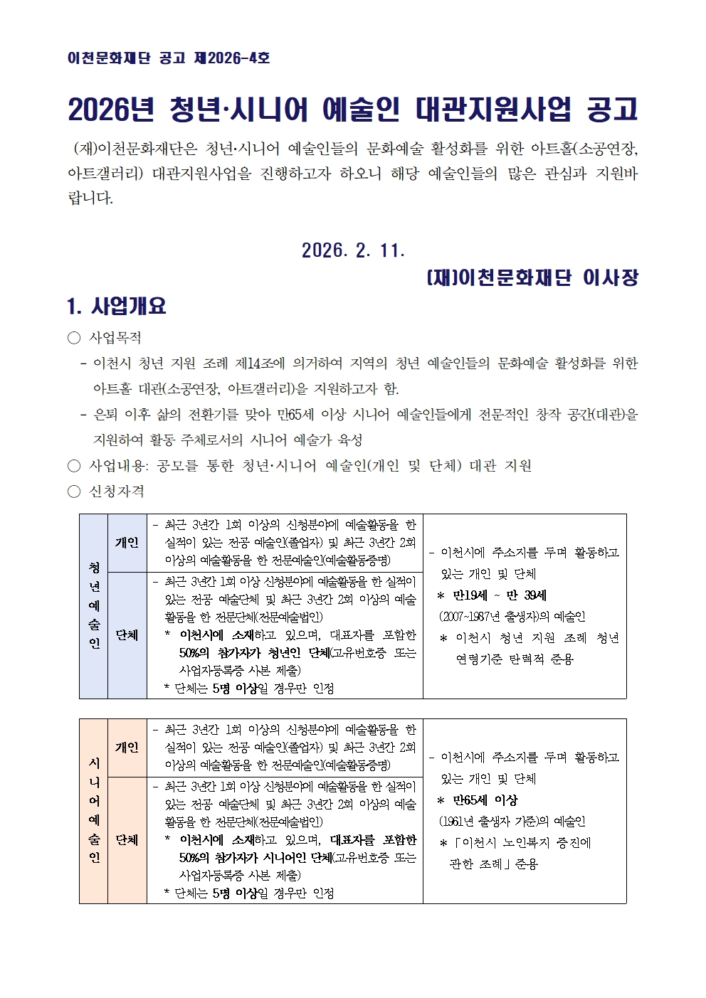 2026년 이천문화재단 청년시니어예술인 대관 지원사업 모집 공고
