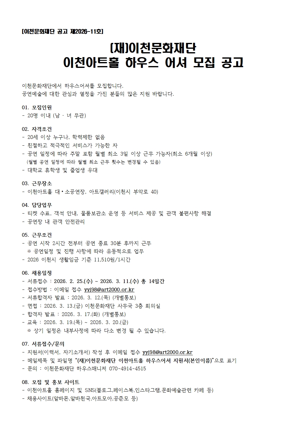 2026 상반기 (재)이천문화재단 이천아트홀 하우스 어셔 모집 공고