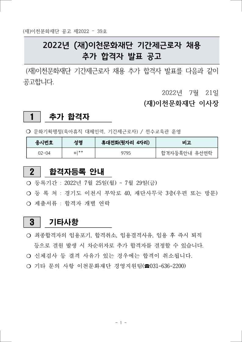 2022년 (재)이천문화재단 기간제근로자 채용 추가 합격자 발표 공고