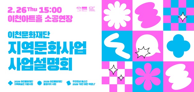 전체 공지 채용 입찰 대관 탭 NOTICE재단소식 더보기 전체 공지 [설명회] 2026년 이천문화재단 지역문화사업 통합설명회 개최(2/26) 2026-02-20 10:27:38 공지 2026년 이천문화재단 청년시니어예술인 대관 지원사업 모집 공고 2026-01-29 14:37:43 공지 [티켓오픈] 2026 이천문화재단 뮤지컬 등등곡 2026-01-28 17:04:09