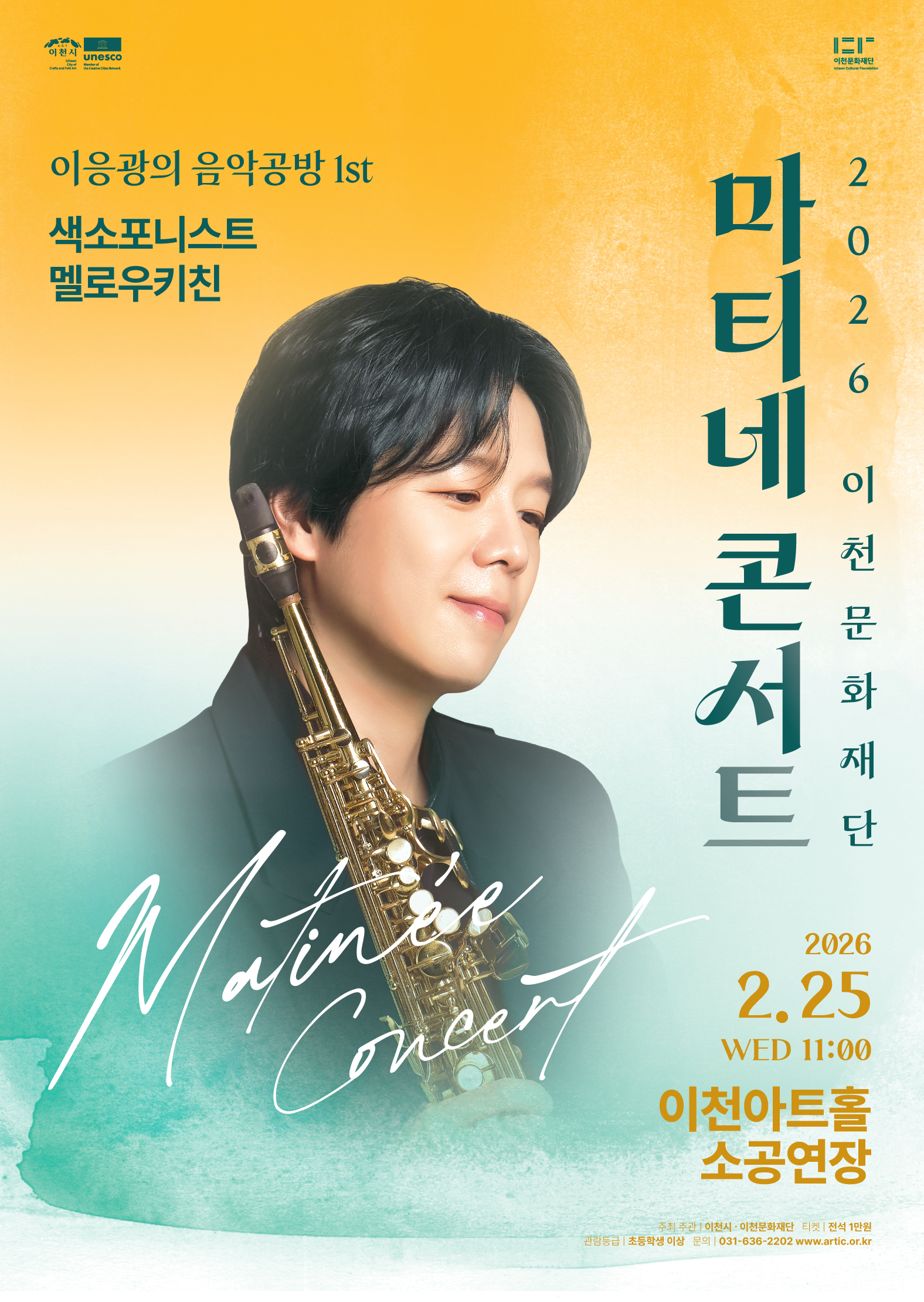 전체,공연,전시,행사,교육 분류 슬라이더 리스트 전체 공연 전시 행사 전체 공연 2026 마티네콘서트 이응광의 음악공방 1st '색소포니스트 멜로우키친' 공연 2026 뮤지컬 사랑의 하츄핑 공연 2026 이천아트홀 인형극 페스티벌 달, 여행 공연 2026 이천문화재단 신년음악회 공연 공연 2026 마티네콘서트 이응광의 음악공방 1st '색소포니스트 멜로우키친' 공연 2026 뮤지컬 사랑의 하츄핑 공연 2026 이천아트홀 인형극 페스티벌 달, 여행 공연 2026 이천문화재단 신년음악회 전시 행사