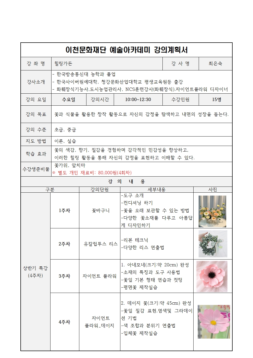 꽃가위, 앞치마, 별도 재료비(80,000원) *강사님 공지 예정