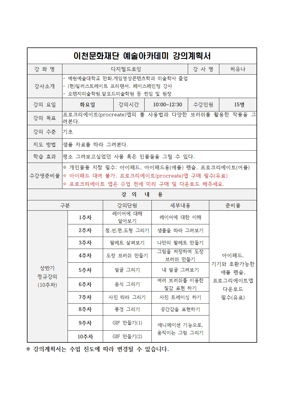 menu 전체메뉴 닫기 이천문화재단 운영목표 연혁 조직도 CI소개 경영공시 윤리인권경영 정보공개 공간소개 기록관 공연/전시/행사 공연일정 전시일정 행사일정 예매안내 아카데미 아카데미 소개 수강신청안내 강좌안내 및 수강신청 축제/지역문화 이천도자기축제 조각심포지엄 지역문화버스킹 지역예술인 지원사업 문화자치사업 대관 대관안내 대관신청(테스트) 커뮤니티 재단소식 자유게시판 1:1문의하기 FAQ