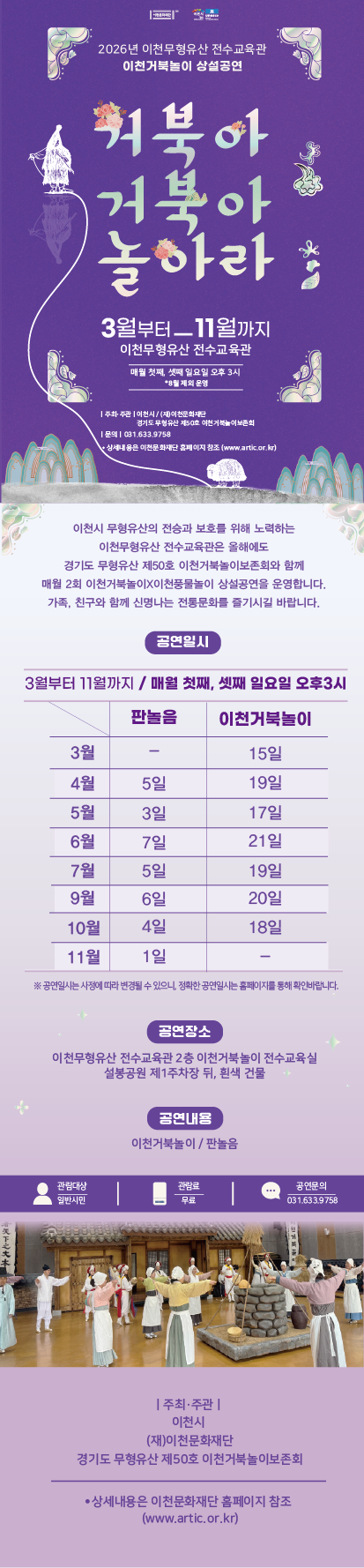 menu 전체메뉴 닫기 이천문화재단 운영목표 연혁 조직도 CI소개 경영공시 윤리인권경영 정보공개 공간소개 기록관 공연/전시/행사 공연일정 전시일정 행사일정 예매안내 아카데미 아카데미 소개 수강신청안내 강좌안내 및 수강신청 축제/지역문화 이천도자기축제 조각심포지엄 지역문화버스킹 지역예술인 지원사업 문화자치사업 대관 대관안내 대관신청(테스트) 커뮤니티 재단소식 자유게시판 1:1문의하기 FAQ