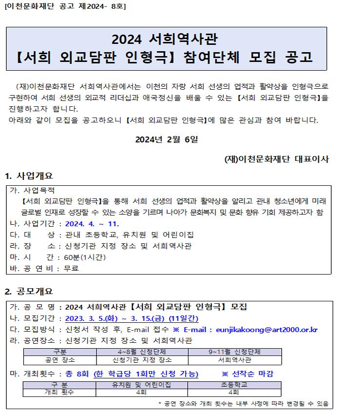 2024 서희역사관 '서희 외교담판 인형극' 참여단체 모집 공고